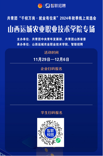 为深入推进“共青团促进大学生就业行动”,切实为2025届毕业生提供就业岗位信息、畅通求职渠道、促进岗位对接、帮助顺利就业,共青团中央青年发展部、共青团山西省委联合山西运城农业职业技术学院、智联招聘开展“千校万岗·就业有位来”2024年秋季线上双选会山西运城农业职业技术学院专场。具体方案如下。