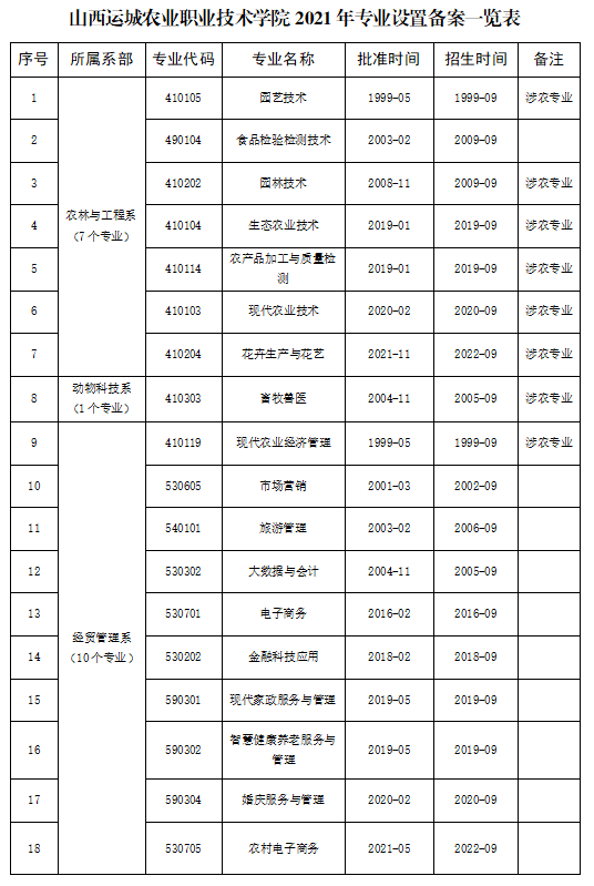 山西运城农业职业技术学院2021年专业设置备案一览表