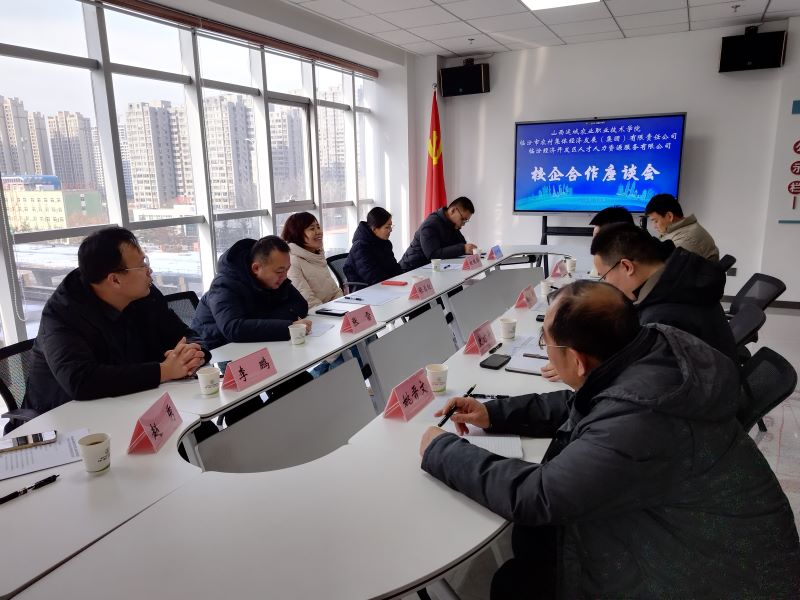 在访企拓岗的第二站临汾市农村集体经济发展有限公司展示厅内,调研组跟随工作人员的解说,详细了解了企业的发展及运营情况。在座谈交流环节,李鹏书记介绍了我院专业建设、人才培养及就业方向,走访单位领导介绍了公司的发展历史、运营情况及用人需求。双方就下一步深入合作开展交流研讨。