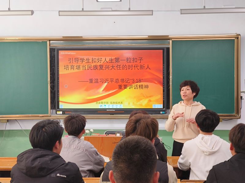 思想政治理论课教学部张益红主任首先回顾了习近平总书记“3·18”重要讲话精神,她要求全体思政课教师要从“培养什么人、怎样培养人、为谁培养人”这一根本问题出发,从思政课“培根铸魂、启智润心”的使命出发,自觉地以“六个要”“八个相统一”严格要求自己,把思政课的道理讲深讲透讲活。她勉励学生要发挥先锋模范带头作用,扎实开展理论学习、积极参加学院各种志愿服务活动,努力成长为担当民族复兴大任的时代新人。